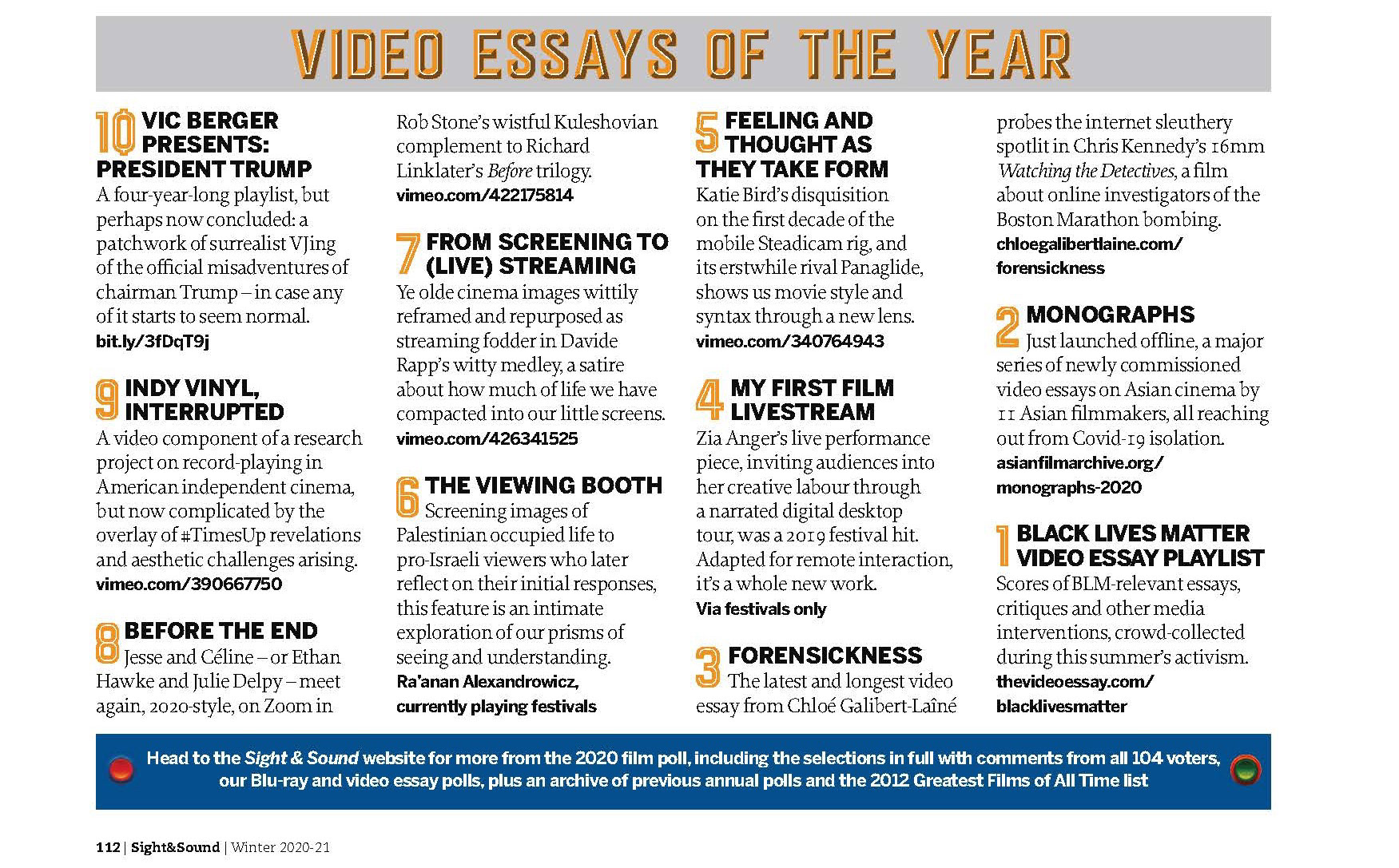 Playlist Named the Best Video Essay of 2020 by the Editors of Sight & Sound, Winter 2020-21.